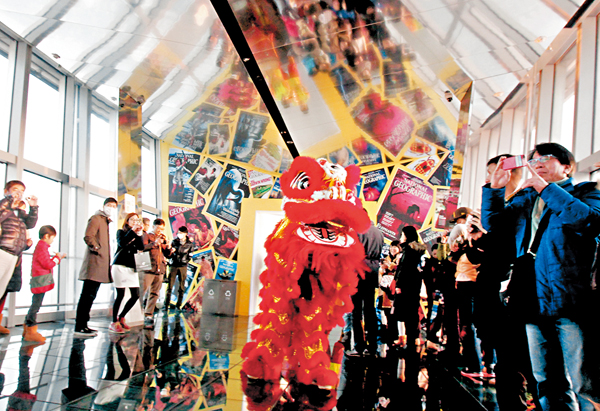 ■遊客在環球金融中心觀光廳觀看舞獅表演。 新華社