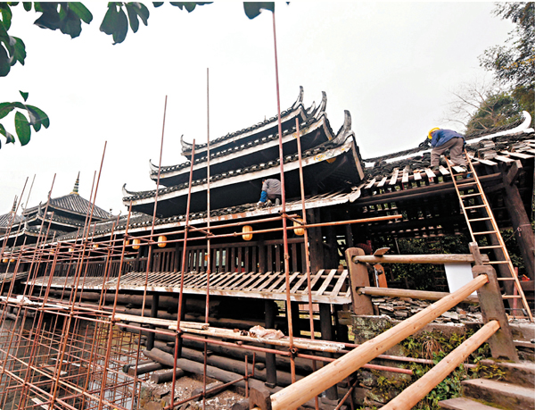廣西三江侗族自治縣林溪鎮程陽永濟橋昨日開始了為期90天的封閉維修。該橋1982年被國務院公佈為全國重點文物保護單位,與趙州石拱橋、瀘定鐵索橋以及羅馬尼亞諾娃沃鋼樑橋並稱世界四大歷史名橋。圖為昨日,侗族群眾在該橋上拆卸舊瓦片。 ■新華社