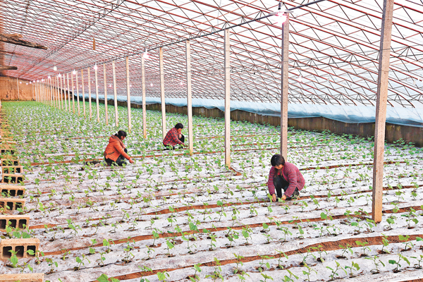入冬以來,山東省臨沂市沂南縣蔬菜部門積極推廣「蔬菜補光燈」,以應對頻發的霧霾天氣。這些「蔬菜補光燈」根據蔬菜所需光譜定製,能夠增加光照、抗病高產,確保瓜果蔬菜在光照不足的天氣下正常生長。圖為昨日,沂南縣蘇村鎮仕子口村菜農在裝有「蔬菜補光燈」的大棚裡管理黃瓜。 文/圖:新華社