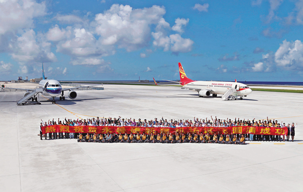 ■兩架民航客機降落南沙永暑礁新建機場。這是相關人員合影留念。 新華社
