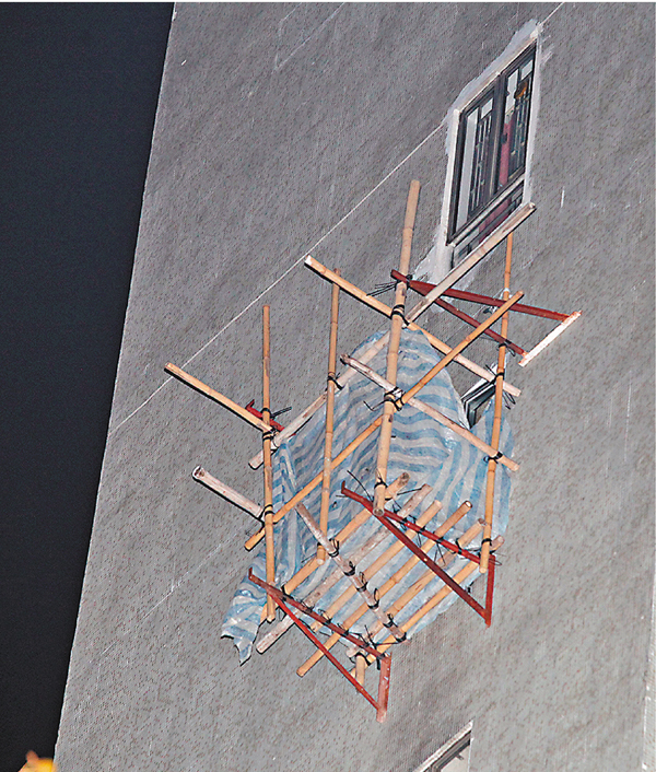 ■天降「石屎雨」現場對上大廈,有單位外牆搭棚架維修。