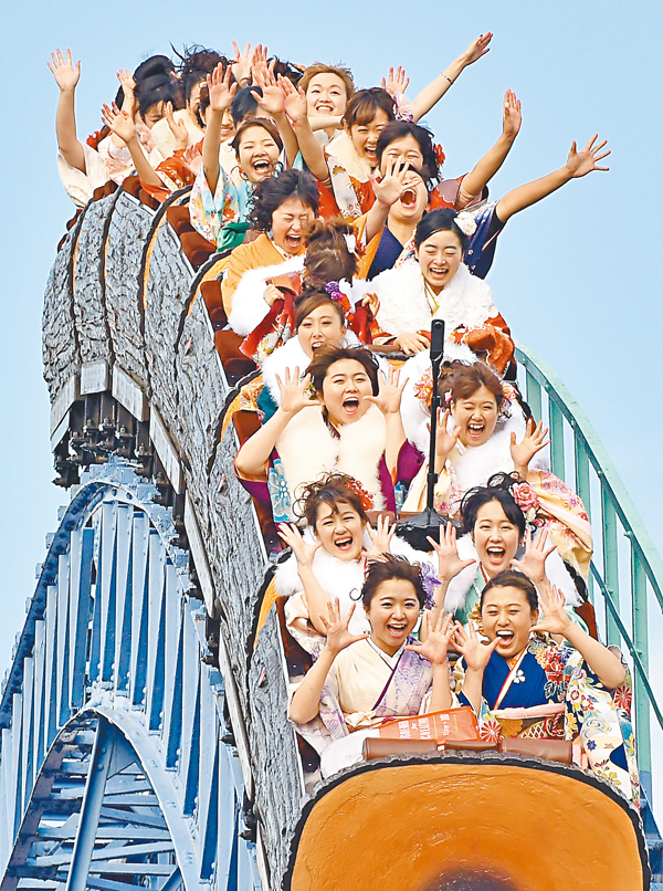 ■東京昨日有女生齊齊玩過山車,慶祝成人式。 法新社