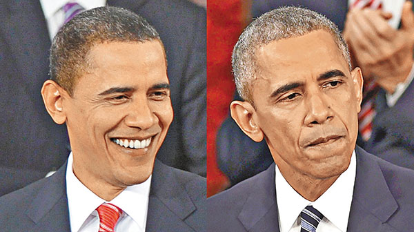 ■對比2010年(左),現今的奧巴馬顯出老態。 法新社