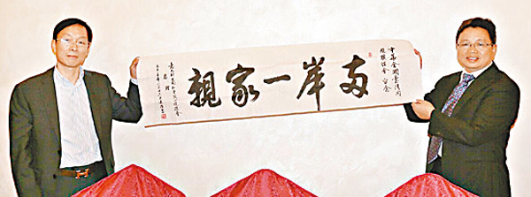 ■意大利中國和平統一促進會秘書長周建煌向全國台聯代表團團長楊毅周贈送紀念品。 本報北京傳真