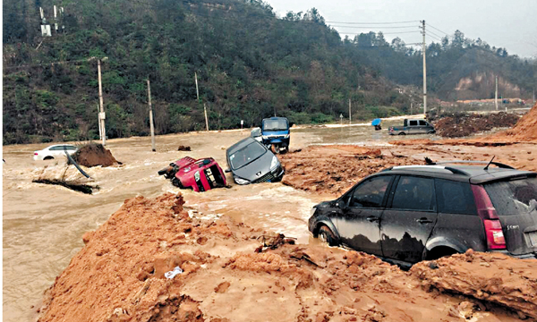 湖北恩施州昨日中午發生一起堰塞湖潰壩事故,出現潰堤的堰塞湖位於恩施市龍鳳鎮三河村白廟橋附近。據悉,堰塞湖的容量約幾十萬立方,下洩湖水已造成下游一個村莊大量車輛被淹。目前,恩施及龍鳳鎮已組織力量前往救援,尚沒有人員傷亡的報告。圖為事故現場被毀的車輛。 ■中新社