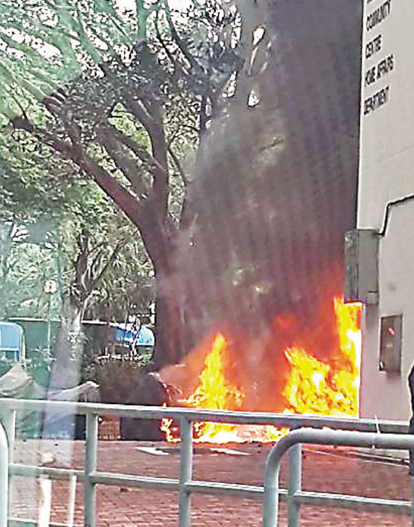 香港文匯報訊 (記者 杜法祖) 大埔昨午發生私家車掃倒一列停泊電單車的交通意外,意外中雖無人受傷,但肇事私家車隨即茪鶠A並再波及遭掃倒的7輛電單車,結果8車「同歸於盡」,全遭燒成廢鐵。