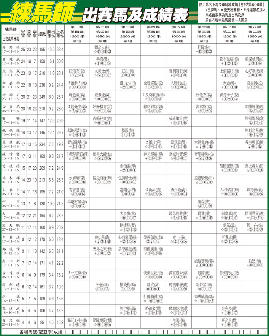 練馬師出賽馬及成績表 (2016-01-20) (圖)