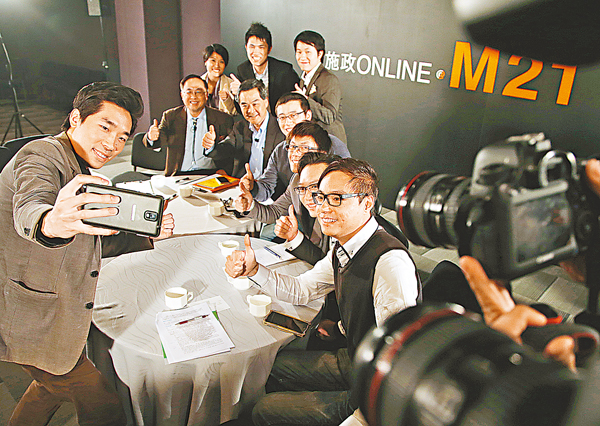 ■節目結束後,梁振英與其他出席者一起自拍,並即時上傳上網。 潘達文 攝