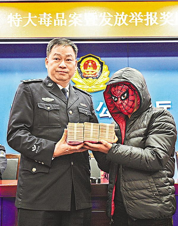 21日,該男子戴上「蜘蛛俠」面具,到廣東省公安廳領取獎金。據悉,為做到絕對保密,警方不僅為該男子提供頭套等保護隱私工具,更親自派員護送其往來廣州和佛山。