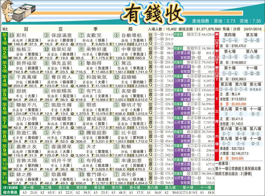 周日沙田十一場泥草賽排位配搭表 (2016-01-22) (圖)