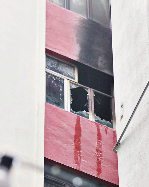 ■發生暖爐火警的加寧街華高大廈單位窗戶玻璃燒爆,外牆遺下燒焦痕[。