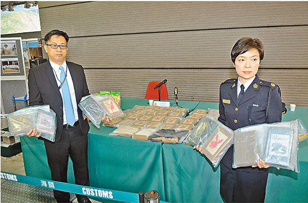 ■海關展示檢獲印有PLAYBOY標誌的可卡因毒品。
