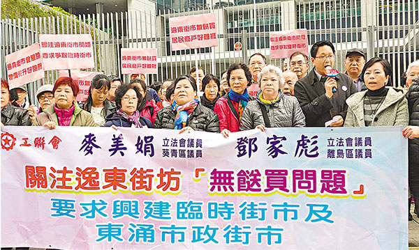 工聯會立法會議員麥美娟和鄧家彪昨日與東涌居民請願,要求政府盡快在逸東h成立臨市街市,並在東涌區內興建食環署街市,確保鮮肉和蔬菜供應穩定。