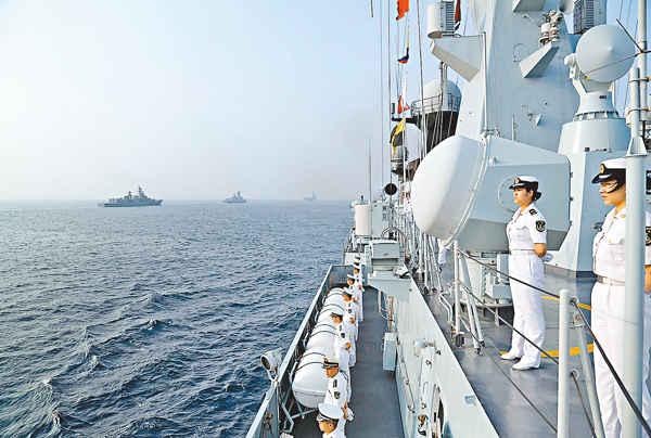 ■中國海軍官兵在演練中與多國海軍艦艇分航。 中新社
