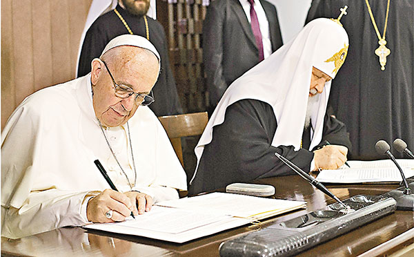 ■方濟各和基里爾在會後簽署聯合宣言。 路透社