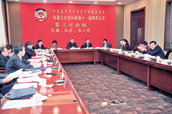 ■農工黨內蒙古自治區委黨員參加內蒙古政協十一屆四次會議小組討論。實習記者圖們 攝