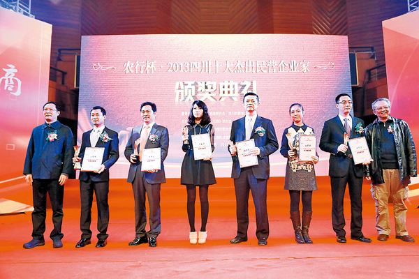 ■2013年,洪清宜(左五)在「四川十大傑出民營企業家」評選中獲得「社會責任獎」。 本報成都傳真