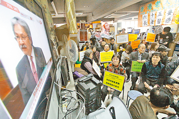■社協與基層市民看直播預算案。 黃偉邦 攝