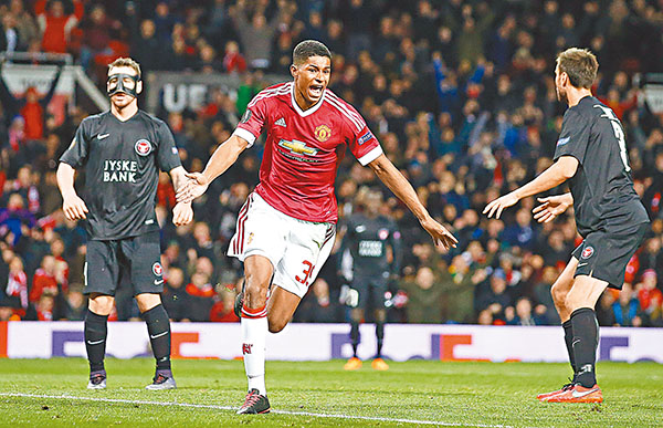 ■橫空出世的曼聯小將拉舒福特(左二)梅開二度。美聯社