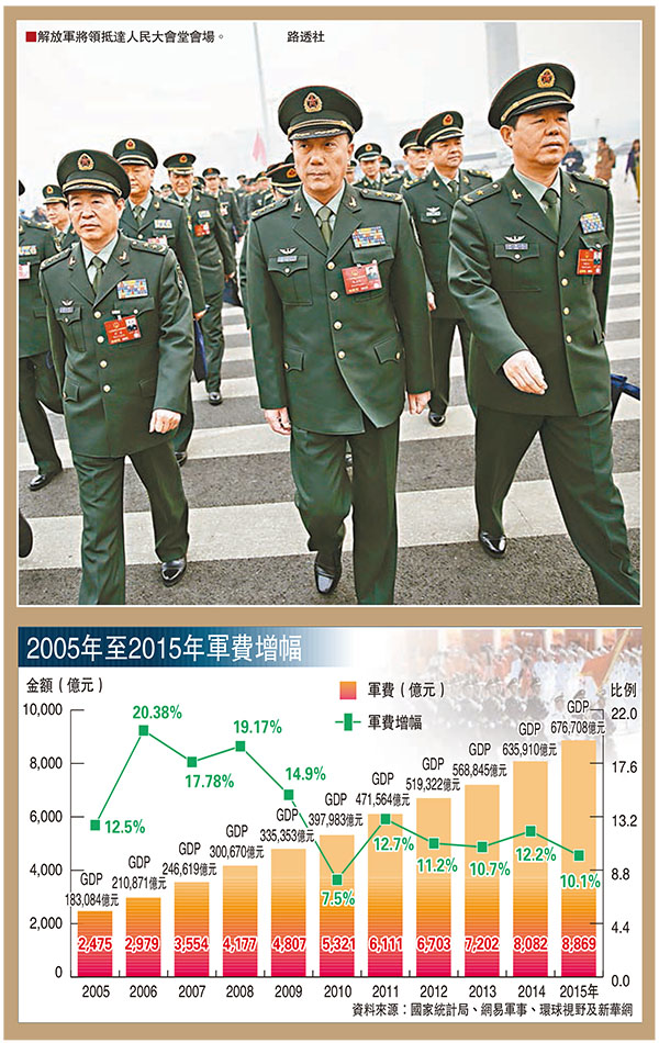 香港文匯報訊(記者 朱燁、劉凝哲 兩會報道)今年中國軍費將從前幾年的兩位數增長,下降到個位數增長,這是昨日召開的十二屆全國人大四次會議首場新聞發佈會「最具爆炸性的新聞」。大會發言人傅瑩就此透露,今年中國軍費預算將保持增長勢頭,但只維持在7%至8%之間。在回答西方記者關於中國擴建南沙島礁「威脅南海和平穩定」的提問,傅瑩直言「這是不是有點語言霸權」,此類討論意在製造議題,是將威脅地區和平、影響航行自由的「大帽子」扣在中國頭上,「做法容易誤導形勢」。