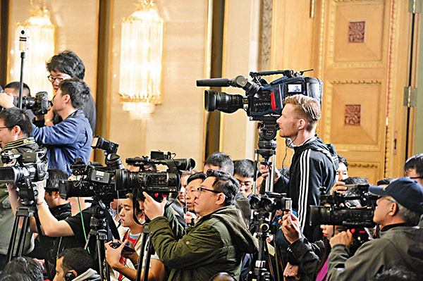 ■十二屆全國人大四次會議昨日在北京人民大會堂舉行新聞發佈會。圖為中外記者在現場採訪。新華社