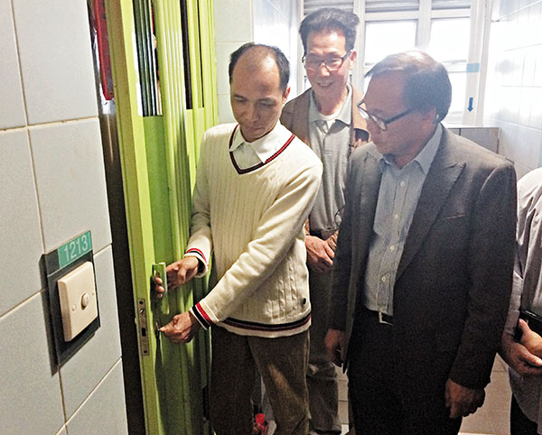 ■梁志祥(右)即場成功示範以一住戶鎖匙開啟對上樓層兩戶的鐵閘鎖。左二為陳先生。受訪者供圖