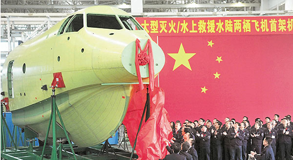 唐長紅表示,中國自主研製的「三個大飛機」之一的AG600是當今世界上在研的最大一款水陸兩棲飛機,最大起飛重量為53.5噸、機體總長36.9米,翼展38.8米,是國家應急救援體系建設急需的重大航空裝備。2016年是AG600飛機研製的決勝之年,承擔AG600飛機首飛任務的001架機已基本完成機體結構大部件及成品交付,全面開展總裝工作;進行靜力試驗的002架機完成機頭、中機身、中後機身、後機身、尾翼等大部件交付。