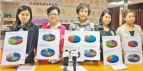 香港婦聯於1月以問卷形式訪問487名市民,當中有408名女士、79名男士。調查發現,有27%受訪者認為家庭生活不快樂,當中以入不敷支、家人很少見面及居住環境惡劣為不快樂的主因,分別佔19%、15%及12%;相反,64%受訪者認為家庭生活快樂,因為家庭和睦、家人健康及居住環境舒適。