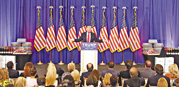 美國共和黨總統初選參選人特朗普氣勢凌厲,在前日4個初選或黨團會議州份中再奪3州,贏得共和黨提名的機會進一步上升。意氣風發的他在佛羅里達州記者會上,端出以自己名稱為品牌的紅酒和清水,又「復刻」已不再發售的厚切牛扒款待支持者,反擊上屆大選共和黨候選人羅姆尼早前指他不善經商的批評。