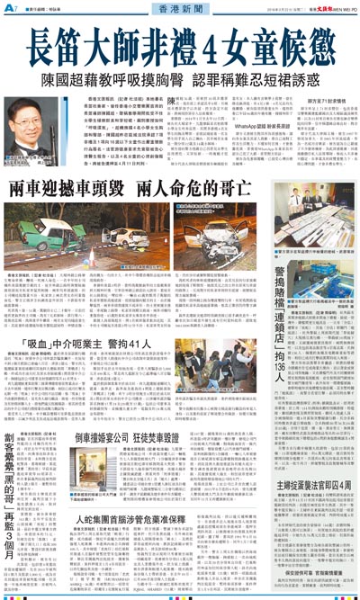案情指,2014年1月至去年12月間,被告在大埔家中、九龍塘區某名校教導小學女生吹奏長笛,其間多番摸4名女學生的胸及臀部,並曾試過捉茪@名女學生的手放入自己褲內。其中兩名女童是一對分別12歲及14歲小姊妹。