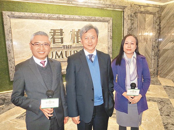 ■長實執行董事趙國雄(中)表示,會盡快公佈君柏新一批單位價單,及加入大手購買安排,仍期望抓緊機會於復活節假期內推售。 記者 梁悅琴 攝