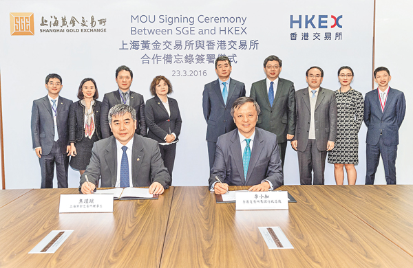港交所行政總裁李小加及上海黃金交易所理事長焦瑾璞昨在港簽訂合作備忘錄。兩家交易所多名高層代表亦出席見證簽署儀式。