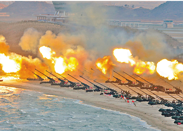 朝鮮半島局勢持續緊張,朝中社昨日報道,最高領導人金正恩早前指揮朝鮮人民軍進行炮擊演習,揚言要「踏破」韓國首都首爾,又點名批評韓國總統朴槿惠是美國傀儡。韓方估計演習前日在東部城市元山附近舉行,約有10多架飛機及大量遠程炮參與,可能針對青瓦台及政府辦公室等主要設施。