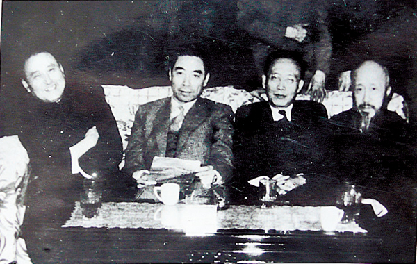 ■黃方毅家藏照片:1946年,黃炎培、周恩來、郭沫若、沈鈞儒合影(從左至右)。作者供圖