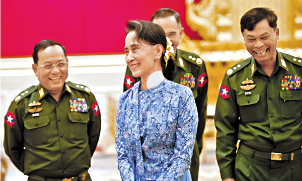 ■昂山在就職典禮上向軍方微笑。 路透社