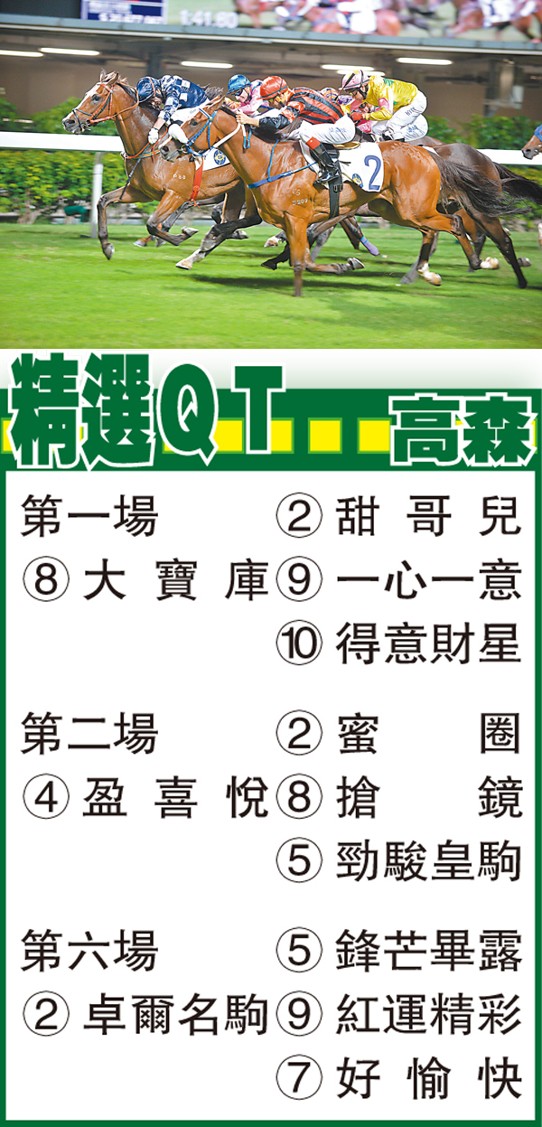 第一場、第五班、一六五○米。「大寶庫」(圖前駒)月初試泥閘沿途跟前居內欄位,末段拉出大外疊,便以按韁姿態加速而上得第二,而第一名乃日前初出即上名的「曾幾何時」,可見狀態已具水準,磨利而來未能輕視。「一心一意」以上仗賽前試谷閘所見,狀態已處不俗水平,結果久休復出跑泥賽一哩大敗,現用王牌重返窄場,提防出冷。