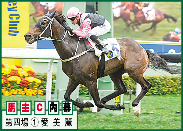 第四場、第四班、一八○○米。「愛美麗」現年三歲出賽五次經驗尚淺,近三仗中卻拿下一W一Q,進度一日千里,最佩服是告東尼的練馬功力,跑至第四次已贏千八,實在是少見例子。此駒未完全成熟,早課或陣上仍有很大改善空間,而今仗首次渡江出爭千八米,眼見前次贏得輕鬆,今回縮爭二百米兼跑窄場對手爾爾,有力打翻身仗。