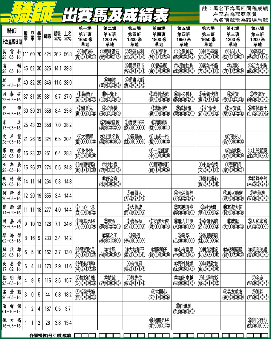 騎師出賽馬及成績表 (2016-03-31) (圖)