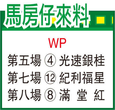 第五場、第四班、一六五○米。「光速銀桂」此程十四戰得三冠兩亞兩季成績,季初在谷草千二米取得勝利,純贏多少班次之利,稍後升上三班便按兵不動,近期降回四班上陣已重拾優勢,近仗復於此程上名,操勇再來,已有再啟勝門資格。