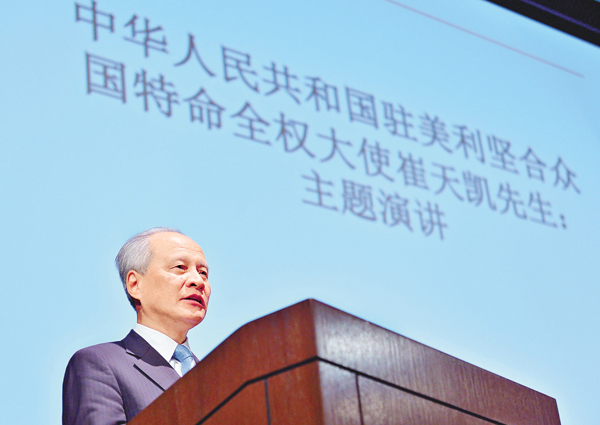 崔天凱說,加強人民之間友好交往和心靈溝通是消除誤解偏見的有效方式,兩國青年是中美關係的未來和希望。希望在美國學習的廣大中國留學生作中美之間的橋樑和紐帶,把兩國友誼與合作的接力棒一代代傳遞下去。