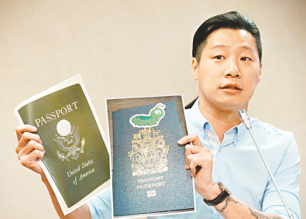 ■時代力量「立委」林昶佐在「立法院」表示,有民眾在護照上貼毛毛蟲把加拿大國名蓋掉,美國民在美護照上貼墨西哥國徽,但卻不會有影響公信力的疑慮。 中央社