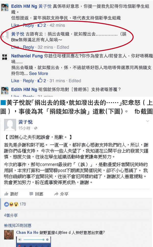 香港文匯報訊(記者 甘瑜)正當黃之鋒等人製造連場公關災難,令到「關公很忙」之際,前「學民思潮」發言人黃子悅也「不甘示弱」,在搶註域名者的facebook留言「挑機」,反被曾捐贈支持「學民」的人質問財政問題。黃子悅竟然「豪言」︰「古語有云︰捐出去嚙,就如潑出去......」被網民炮轟:「呢個就係你地(])對曾經係支持者齔祁苤H」最終黃子悅在其facebook發文章道歉,稱自己因「無心之失」引起「誤會」。