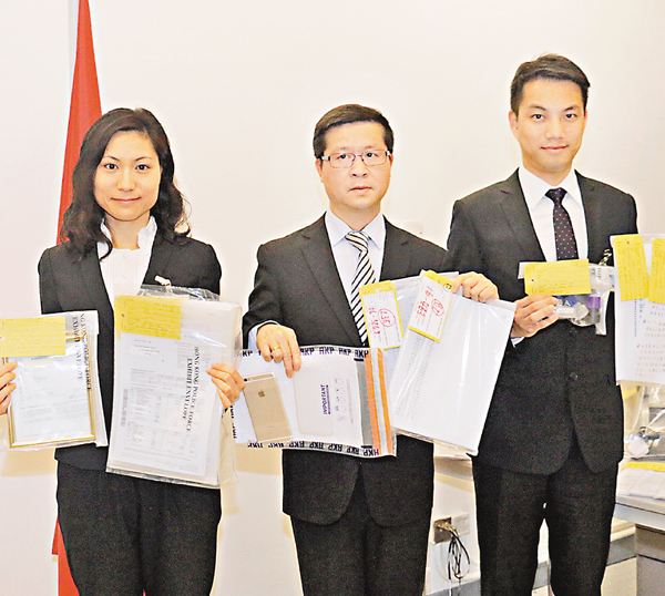 ■灣仔警區刑事總督察冼國明(中)透露,過去9個月在灣仔及中環區內已搗破10間可疑財務中介公司。