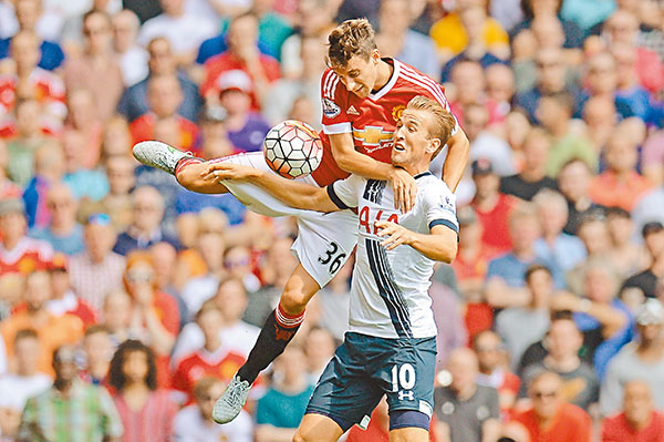 ■熱刺入球王哈利卡尼(右)將是達美安(左)等曼聯守將重點箝制的對象。 資料圖片
