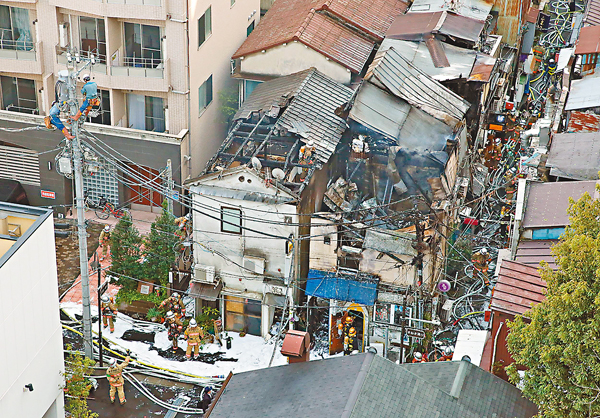 日本東京新宿歌舞伎町昨發生大火,一棟3層高樓宇起火,波及附近3棟建築物,一名60歲女性吸入濃煙不適送院。 ■《讀賣新聞》