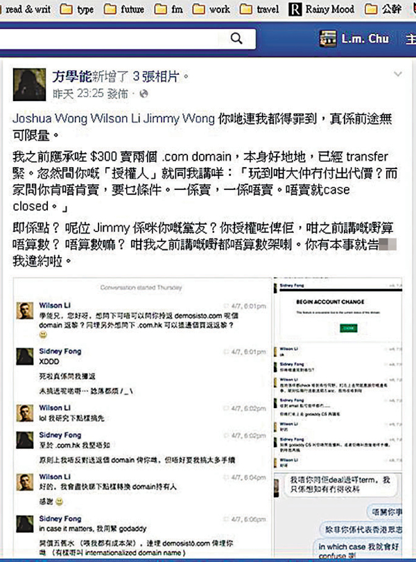 ■方學能大爆「眾志」派人找他贖回域名的內幕。 fb截圖