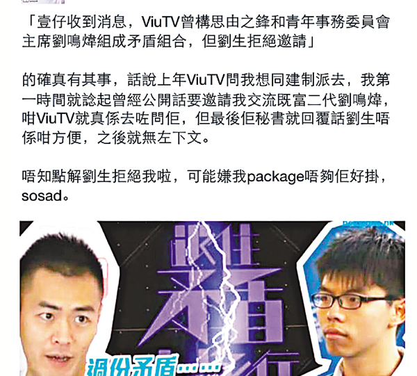 繼聲稱他們「開唔到戶口」,屈銀行「政治打壓」後,黃之鋒又玩新花樣。他在近日帖文,轉載《壹週刊》網上版一篇報道,並節錄其中一段文字:「壹仔收到消息,ViuTV曾構思由之鋒和青年事務委員會主席劉鳴煒組成矛盾組合,但劉生拒絕邀請。」