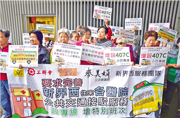 香港文匯報訊 (記者 翁麗娜) 本港不少公立醫院依山而建,因此完善的交通配套相當重要。約二十名來自青衣及天水圍的居民昨日在工聯會立法會議員麥美娟陪同下,到政府總部門外請願,批評往返公立醫院的專線小巴路線的班次、覆蓋範圍都不足應付需求。居於青衣偉景花園的周太太患有黃斑病變,經常到瑪嘉烈醫院覆診,由於車程長又轉折,往返需時近兩小時,感到非常不便。麥美娟表示,曾經詢問小巴公司,對方願意增設407C線,卻不獲運輸署支持。