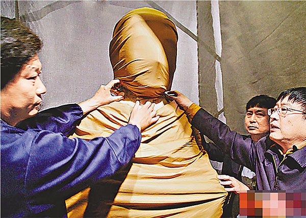 在《曲陽石雕》展廳看到,大佛全身被細緻地用布包裹保護起來,安放在展廳的顯要位置,佛首與佛身已黏接在一起。