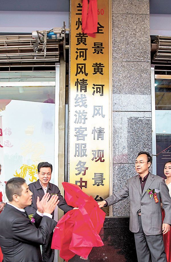 ■蘭州市常務副市長俞敬東(中)、甘肅省旅遊局副局長楊宇宏(右)為中心揭牌。本報蘭州傳真